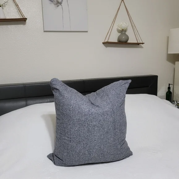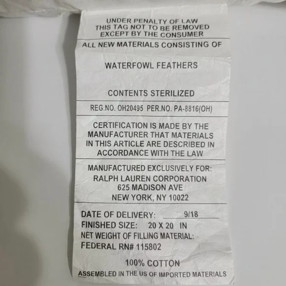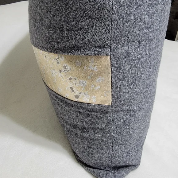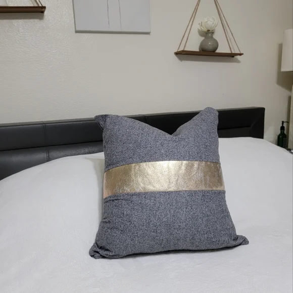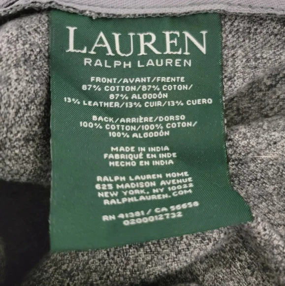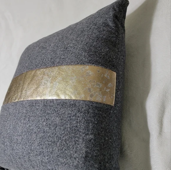 Ralph Lauren 20 x 20Decorative Modern Luxurious Trow Pillow Heathered Gray with a Distressed Gold Leather Stripe across the pillow.This Decorative Pillow comes with:Waterfowl Feathers InsertColors:The Dark Gray in front in back of the pillow 100% Cotton so very soft and cozy feeling to it.The Stripe is LeatherPREOWNED in Excellent Condition